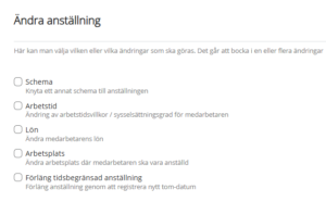 I anställningsguiden kan du som chef registrera flera av de ändringar som kan uppkomma avseende medarbetarnas anställning. Kontrollera under aktuell rubrik nedan om det är en åtgärd som du kan göra i anställningsguiden eller om du behöver göra på något annat sätt.