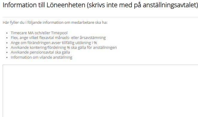 - Fyll i viktig information till löneenheten och anställningsavtal, det är särskilt viktigt att fylla i det som ska skrivas in på anställningsavtalet utöver kort arbetsbeskrivning som kommer in automatiskt inför signering av avtal.