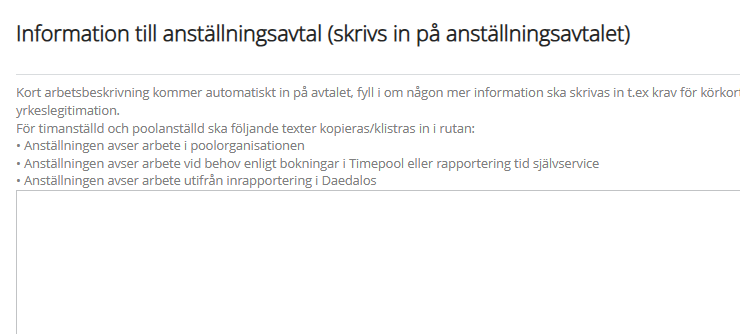 I fältet ”Information till anställningsavtal” skriver du in information som ska skrivas in på anställningsavtalet, till exempel krav för körkort eller yrkeslegitimation. Det kan också vara korttext för pool- eller resursanställning, timanställning eller deltidsbrandman.