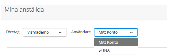 - Välj ”Mina anställda” för att få fram en lista på dina medarbetare, om du är stödfunktion och har fått delegerat av en chef får du välja chefens namn (den som delegerat) i listan för att få fram listan.