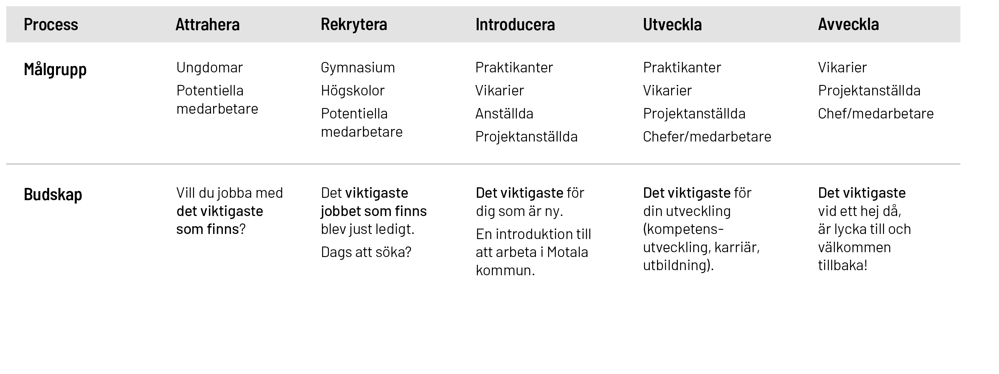 Vi anpassar arbetsgivarvarumärkets budskap, efter vår målgrupp inom respektive område, genom kompetensförsörjningsprocessen.