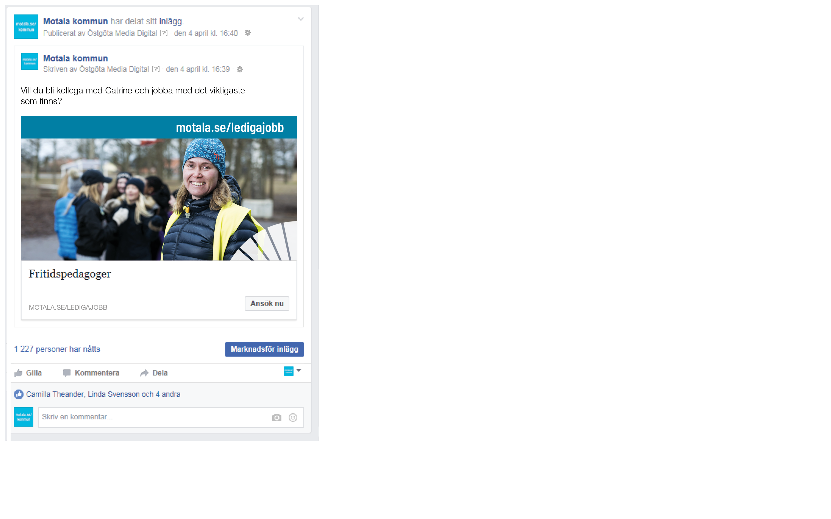 Annonsering av lediga tjänster sker i första hand via Facebook genom våra jobbförmedlare och en platsannons skapas ofta i samarbete mellan chef, personalkonsult och annonsskapare. Alla våra lediga tjänster finns på vår hemsida (motala.se/ledigajobb) och ”Offentliga jobb” (offentligajobb.se).