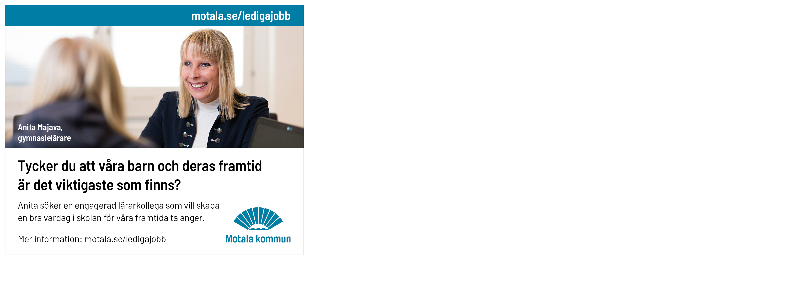 En annons byggs upp med i huvudsak fyra delar; ett budskap, en bild, tjänstens titel och webbadress. Välj budskap utifrån vårt kreativa koncept ”Det viktigaste som finns”. Använd en enkel, kortfattad text i annonsen och ha en mer detaljerad beskrivning av tjänsten under ”motala.se/ledigajobb” och ”offentligajobb.se”.